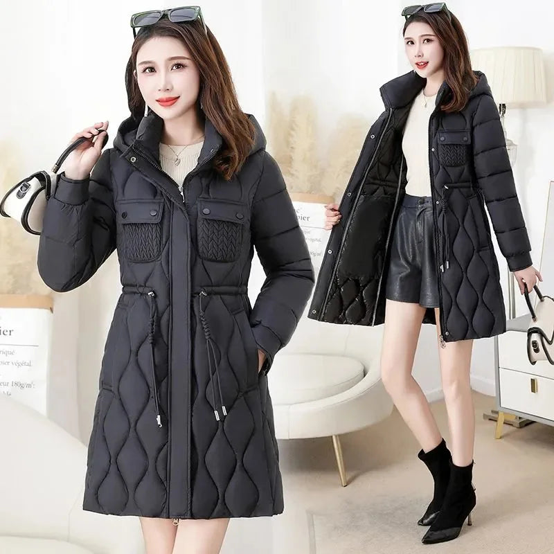 Schwarzer, langer Daunenmantel aus Baumwolle mit Kapuze für Damen