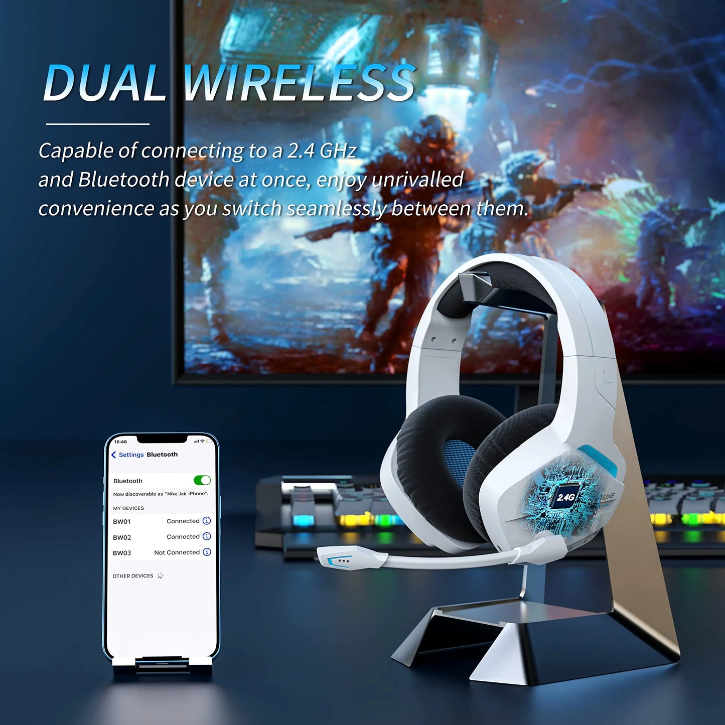 Le casque de jeu sans fil BINNUNE combine une connexion sans fil haute performance 2,4 GHz sans perte pour un son de jeu de niveau professionnel sur PS et PC, avec la commodité d'une connectivité Bluetooth simultanée pour la plupart de vos appareils mobiles.