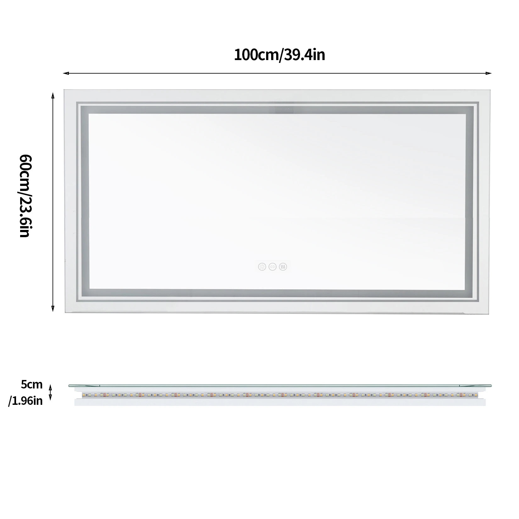 - Trois boutons de commande pour contrôler séparément l'allumage/extinction, les lumières LED et le désembuage.