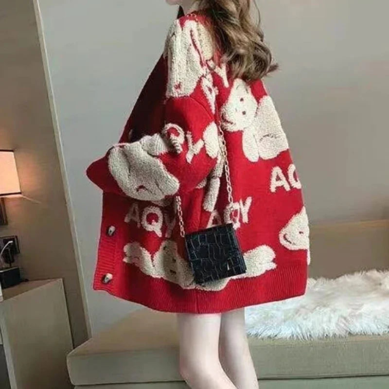 Cardigan rouge à simple boutonnage en tricot imprimé floral pour femme