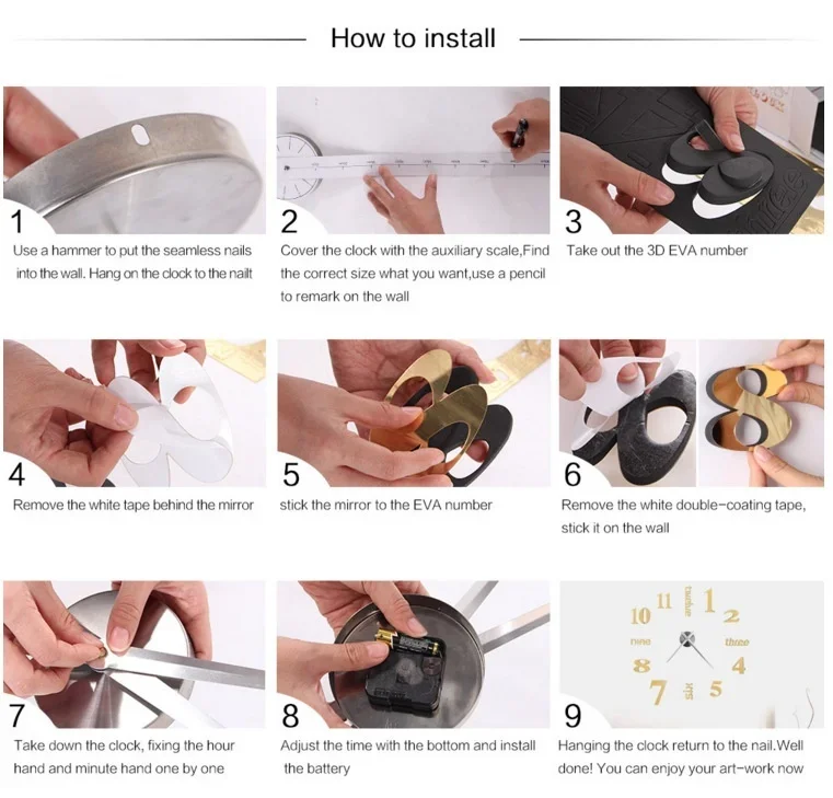 Easy install: The clock include auxiliary scale ruler, self-adhesive stickers and user manual, the clock number and hands have a protective film, please tear off after you finished.