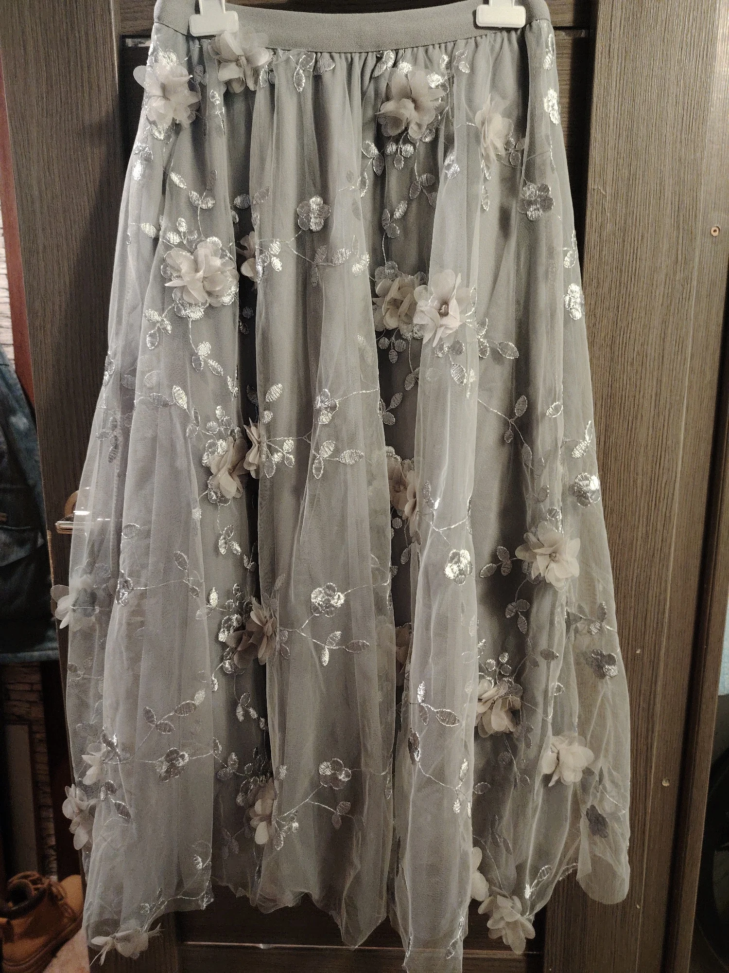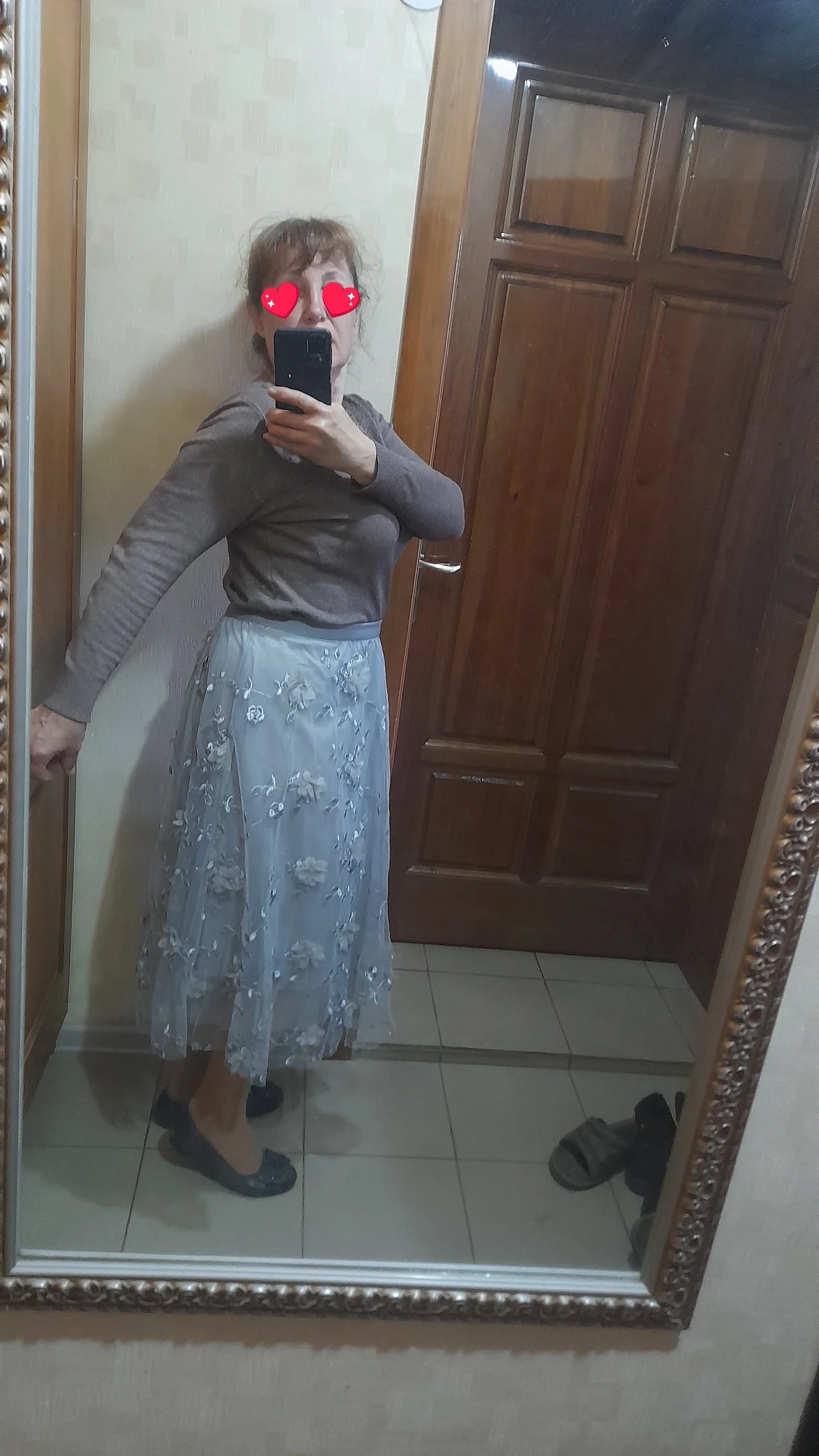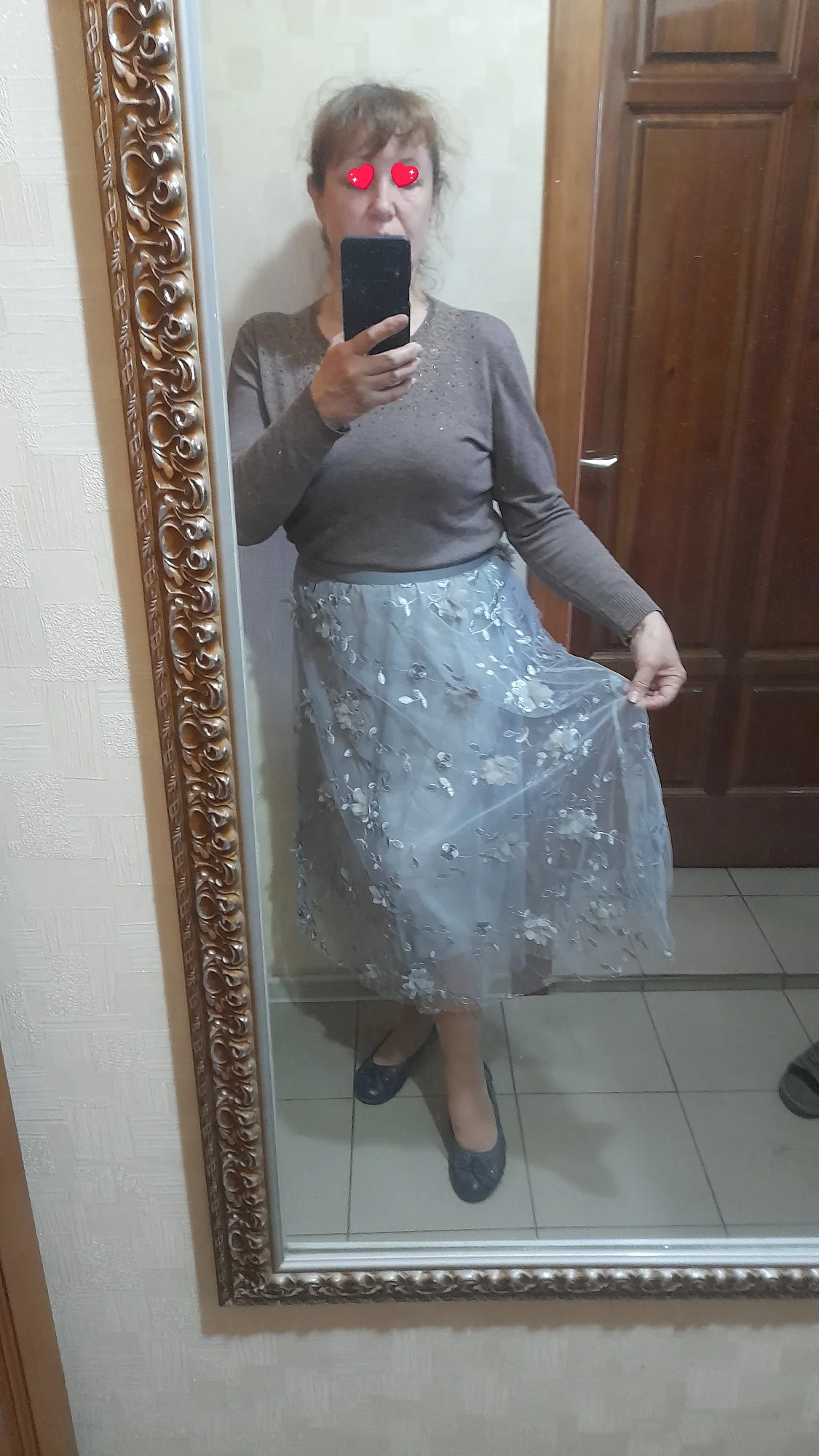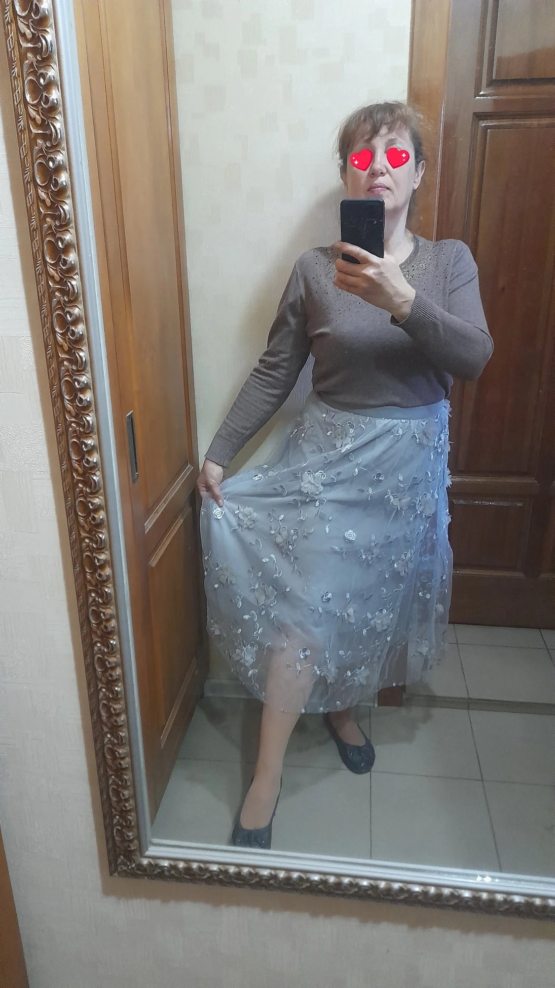 Modesto Nicolas Delivery to the south of Russia takes a little over 2 weeks. Combined with other orders from the Pyaterochka parcel locker. The skirt is elegant and light. Elegant gray color with flower patches, looks very original. For a height of 168 cm, below the knees. Fits a waist of 86 cm, double elastic. One seam at the back. Lined skirt. I recommend purchasing.