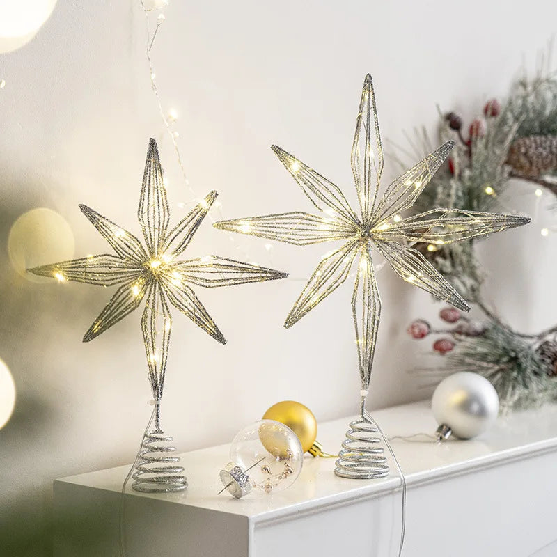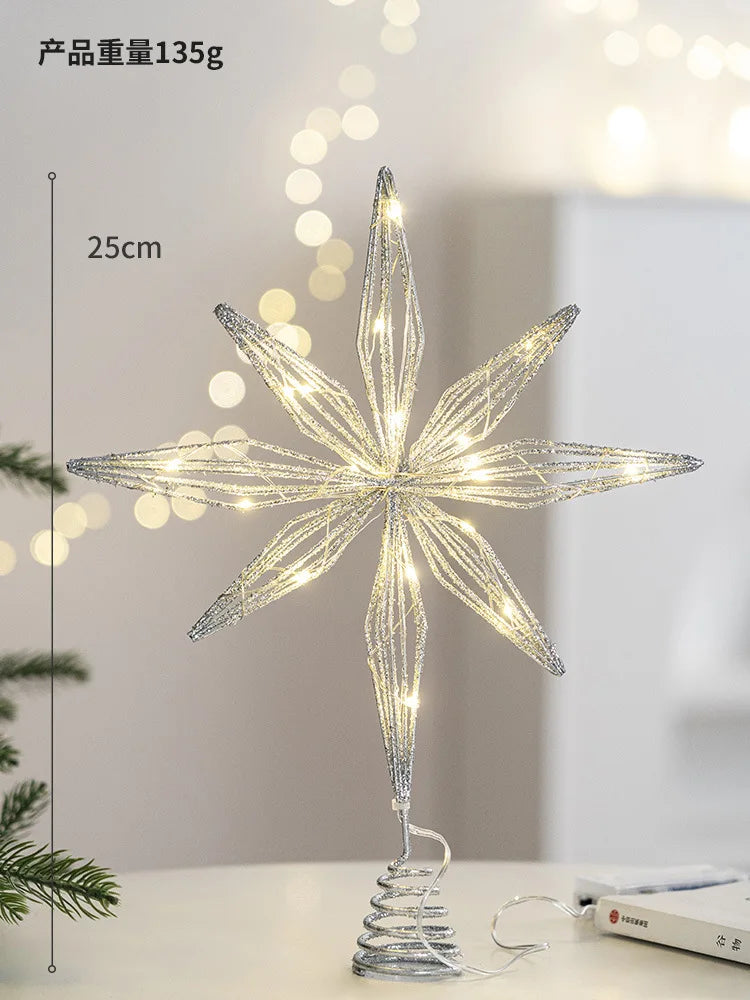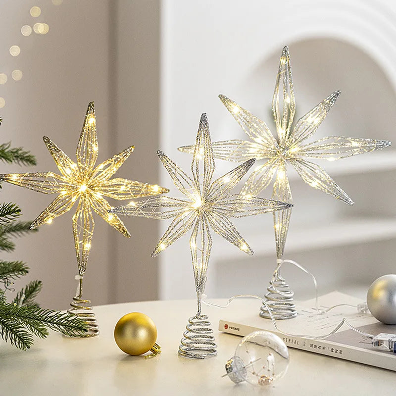 MAS TREE TOPPER. Our Star Tree Topper comes with LED lights around it. Its 8 inch * 10inch size perfectly fits 6ft-7ft Holiday Tree providing such a bright ambiance.