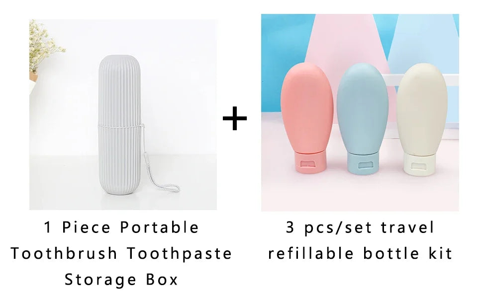 1. Combination includes: 1 Piece Portable Toothbrush Toothpaste Storage Box(Choose one of the colors:white/Green/Gray/Pink ) and 3 pcs/set travel refillable bottle kit