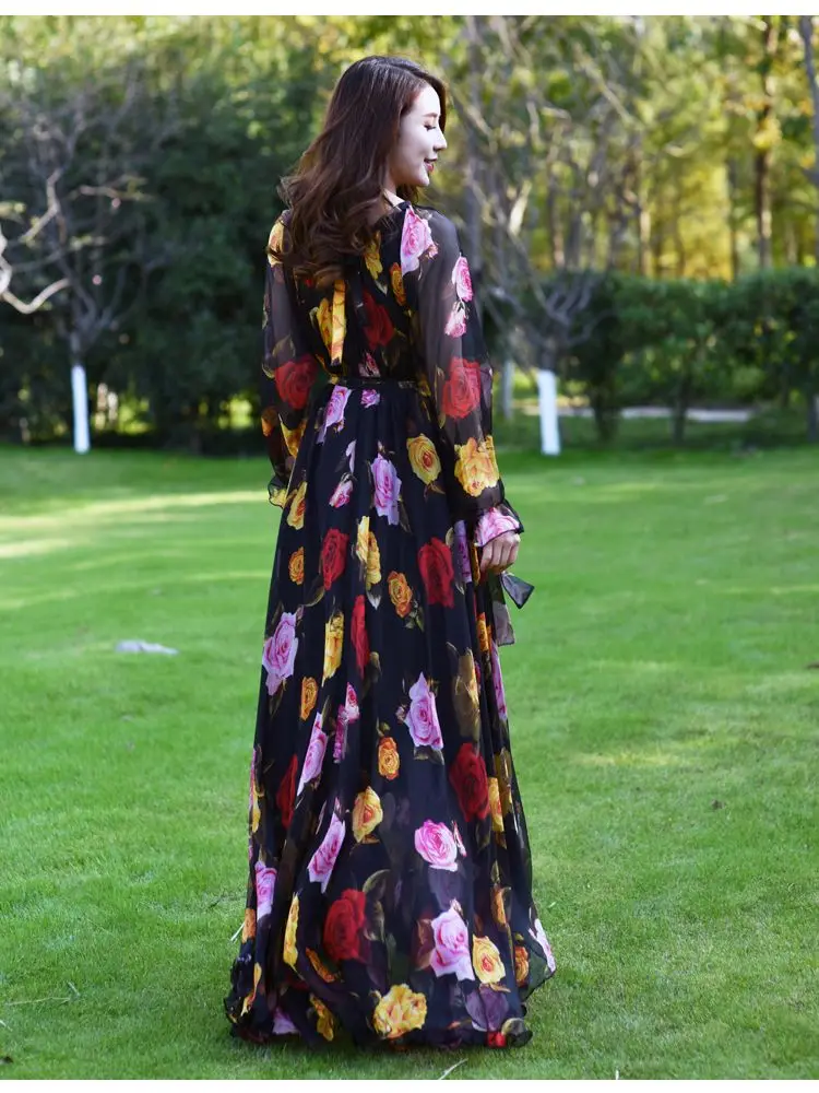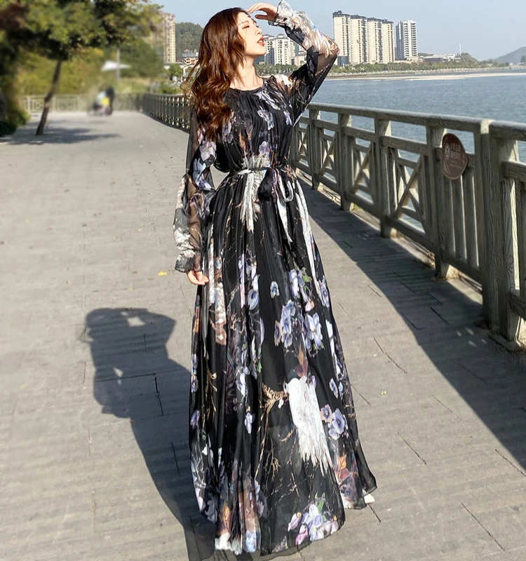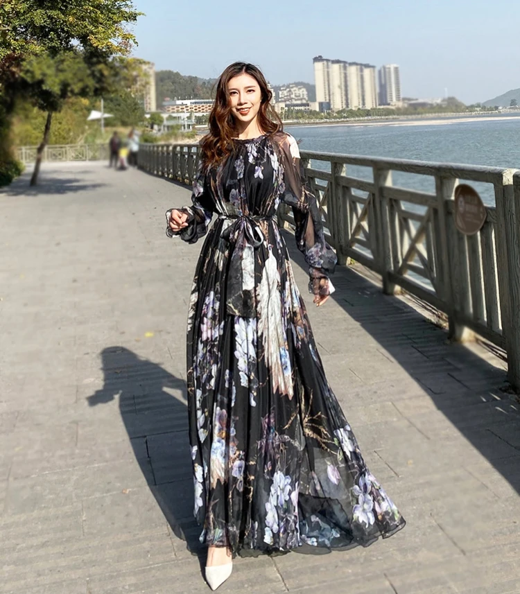 Summer Woman Beach Bohemian Maxi Dress Floral Printed Chiffon Fashion Abaya Islamic Clothes Muslim Saudi Arabia Loose Long Dress