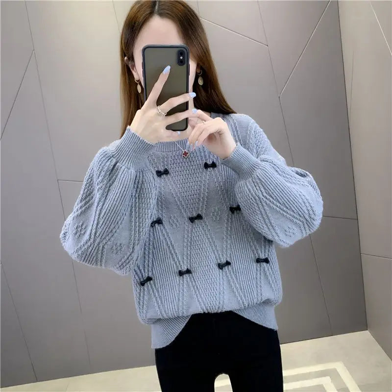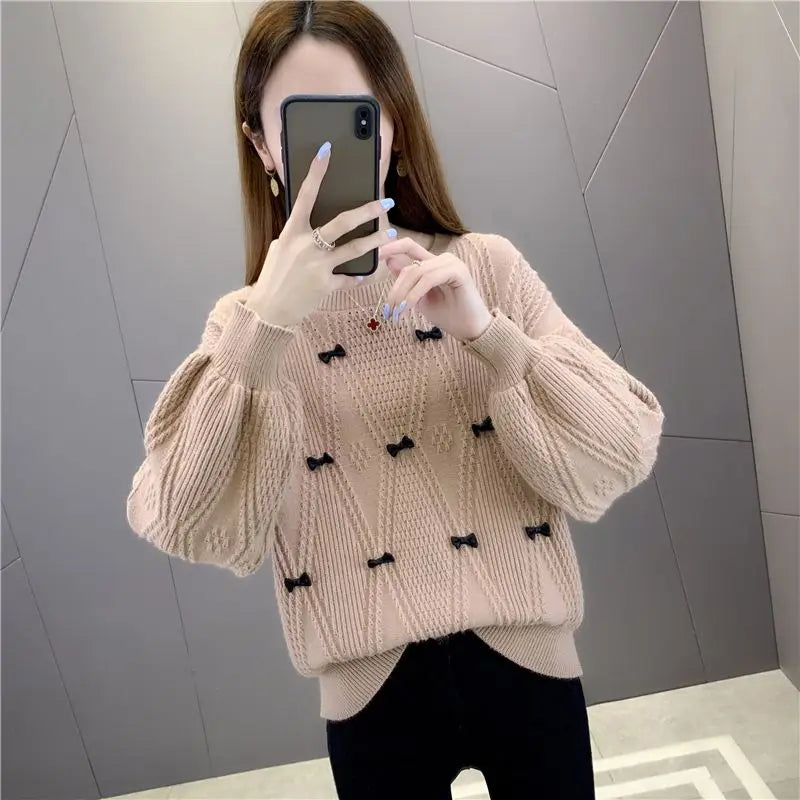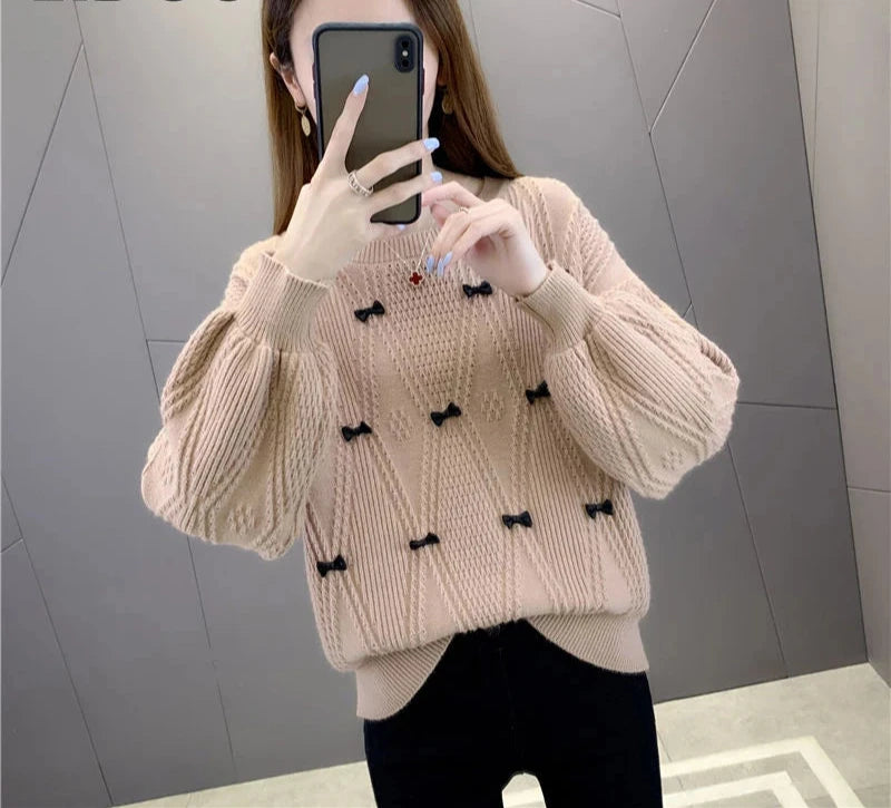 Winter Solid Color Bow Jacquard Sweater